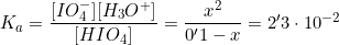 Con esta expresión podemos obtener el valor de x que es la concentración de H3O+ y IO4– en el equilibrio que es lo que queremos calcular.